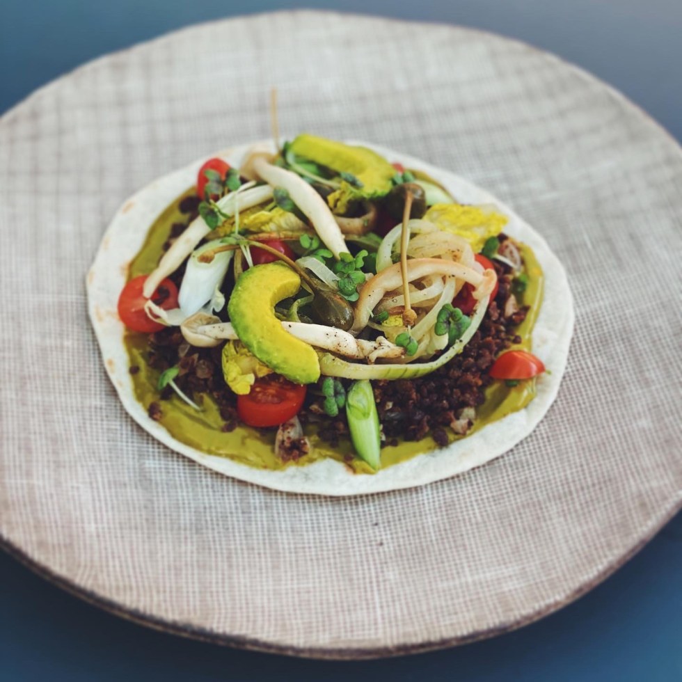 Vega burger, falafel, avocadocrème
